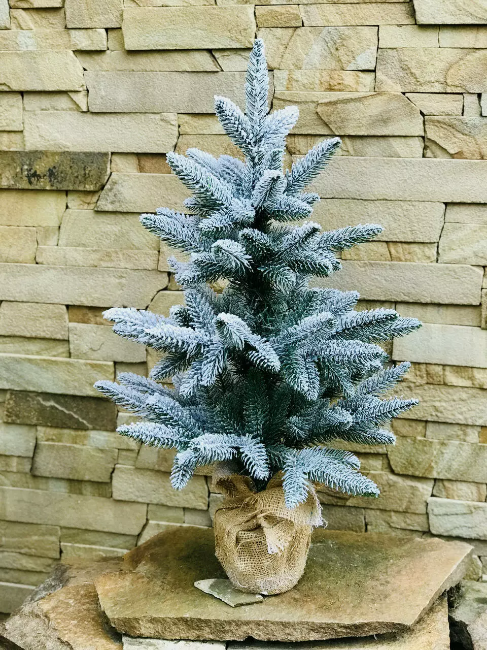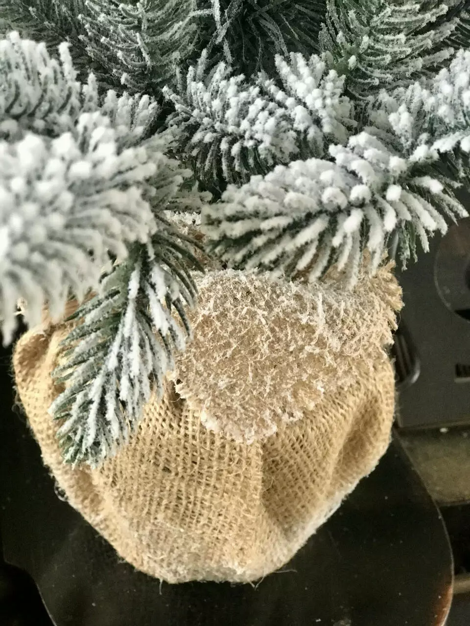Компактна штучна лита ялинка виглядає ошатно навіть без додаткових прикрас. Всі голочки – литі, точна 3D імітація хвої живої ялинки. Встановлена в горщик, прикрашений мішковиною, з обтяжувачем усередині - для захисту від перекидання. Об'ємне густе напилення на ялинці, реалістично імітує сніг, що щойно впав на гілки пухнастими пластівцями. Матеріалом розпилення є натуральна бавовна, вона екологічна і не має запаху, безпечна для дітей та дорослих.