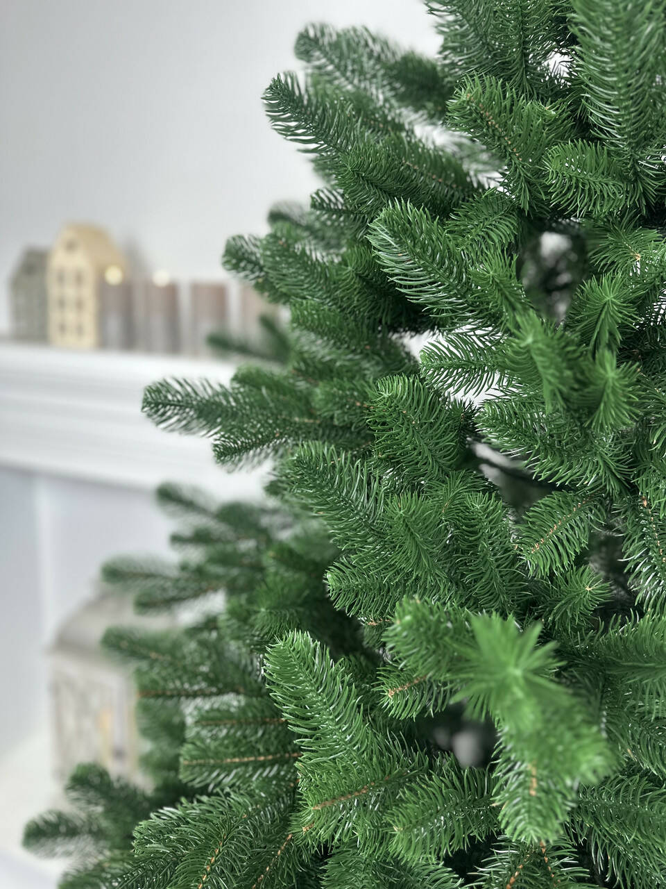Ялинка складається з двох частин, що робить процес складання та зберігання максимально зручним. Міцна металева підставка забезпечує стабільність і надійність. Ширина нижнього яруса становить 120 см, що додає дереву пишності та гармонійних пропорцій.