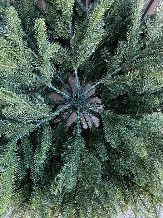 Ялинка складається з трьох частин, що робить процес складання та зберігання максимально зручним. Міцна металева підставка забезпечує стабільність і надійність. Ширина нижнього яруса становить 155 см, що додає дереву пишності та гармонійних пропорцій.