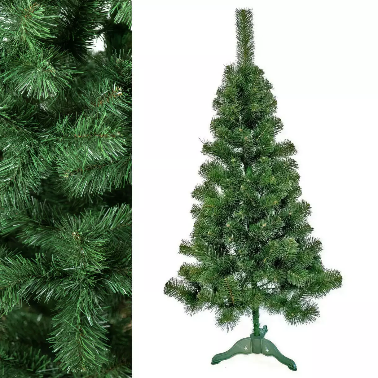 Штучна новорічна ялинка звичайна - чудовий і не дорогий варіант для святкування Різдва та Нового року. Виготовлена з якісної плівки ПВХ, має природний зелений колір гілочок. Її легко встановити за допомогою стійкої пластикової підставки. Висота ялинки з підставкою - 150 см.
